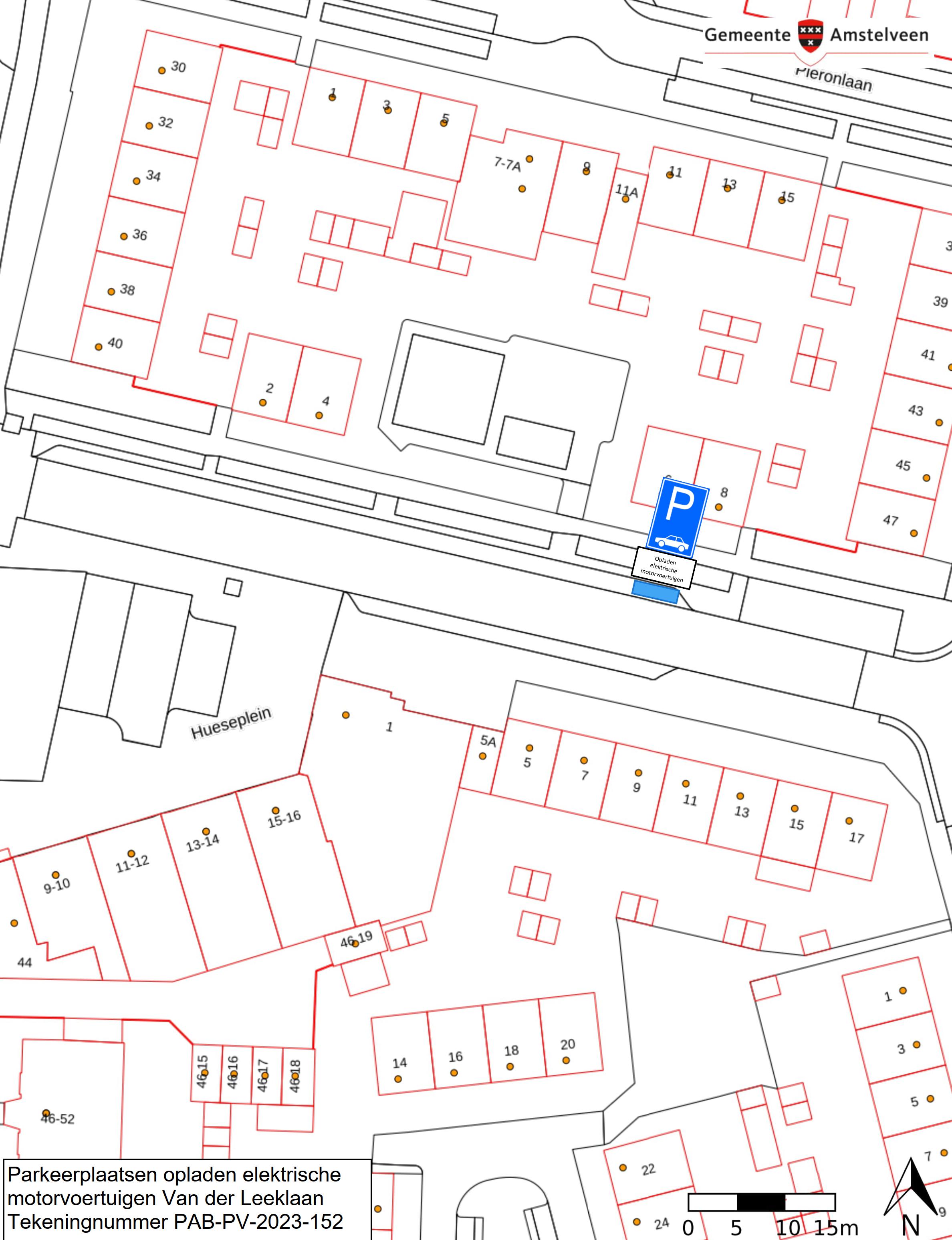 Burgemeester en wethouders van Amstelveen besluiten om in de Van der Leeklaan één parkeerplaats aan te wijzen als parkeerplaats voor het opladen van elektrische motorvoertuigen. De parkeerplaats mag alleen gebruikt worden voor het opladen van deze elektrische motorvoertuigen.