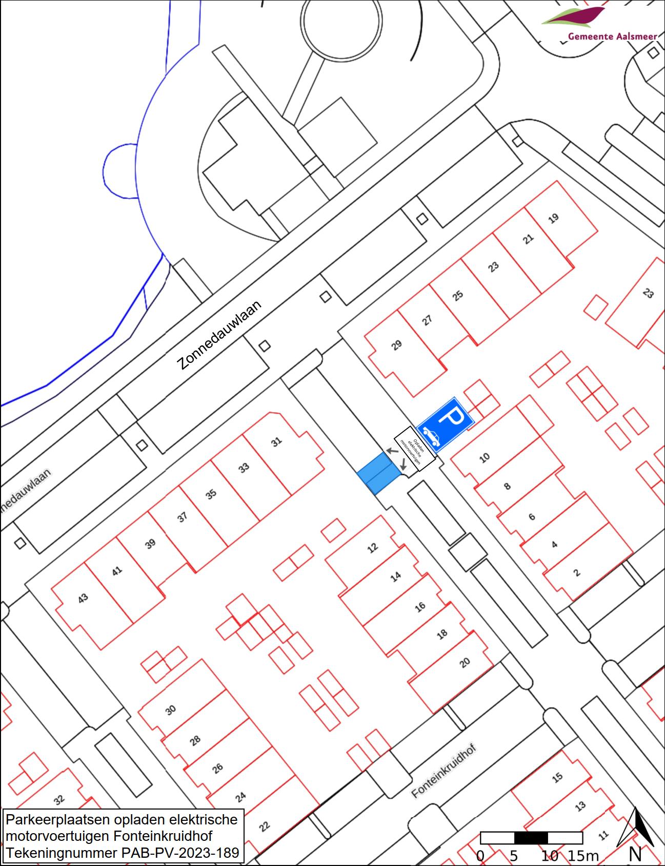 Burgemeester en wethouders van Aalsmeer besluiten om in de Fonteinkruidhof twee parkeerplaatsen aan te wijzen als parkeerplaats voor het opladen van elektrische motorvoertuigen. De parkeerplaatsen mogen alleen gebruikt worden voor het opladen van deze elektrische motorvoertuigen.