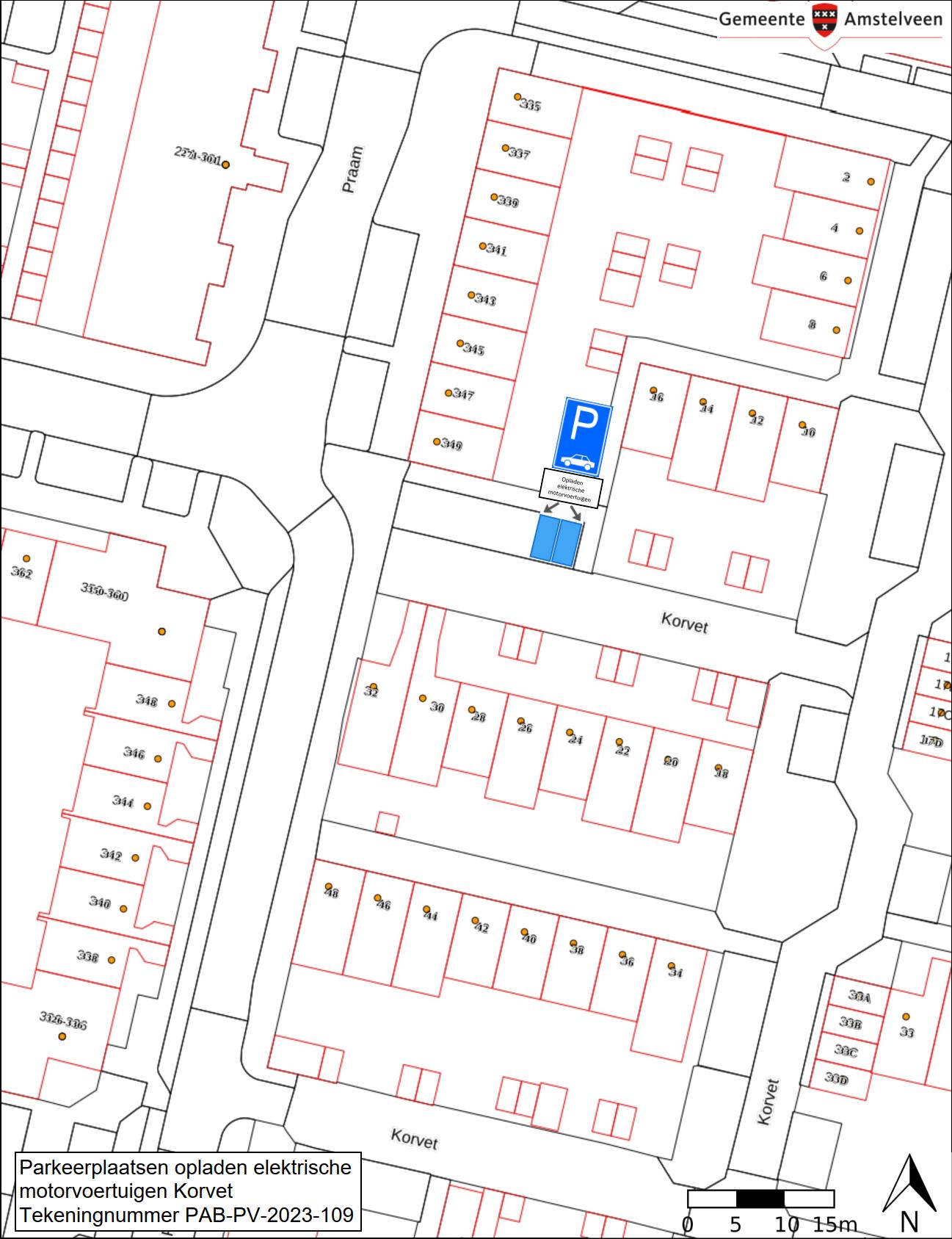 Burgemeester en wethouders van Amstelveen besluiten om in de straat Korvet twee parkeerplaatsen aan te wijzen als parkeerplaats voor het opladen van elektrische motorvoertuigen. De parkeerplaatsen mogen alleen gebruikt worden voor het opladen van deze elektrische motorvoertuigen.