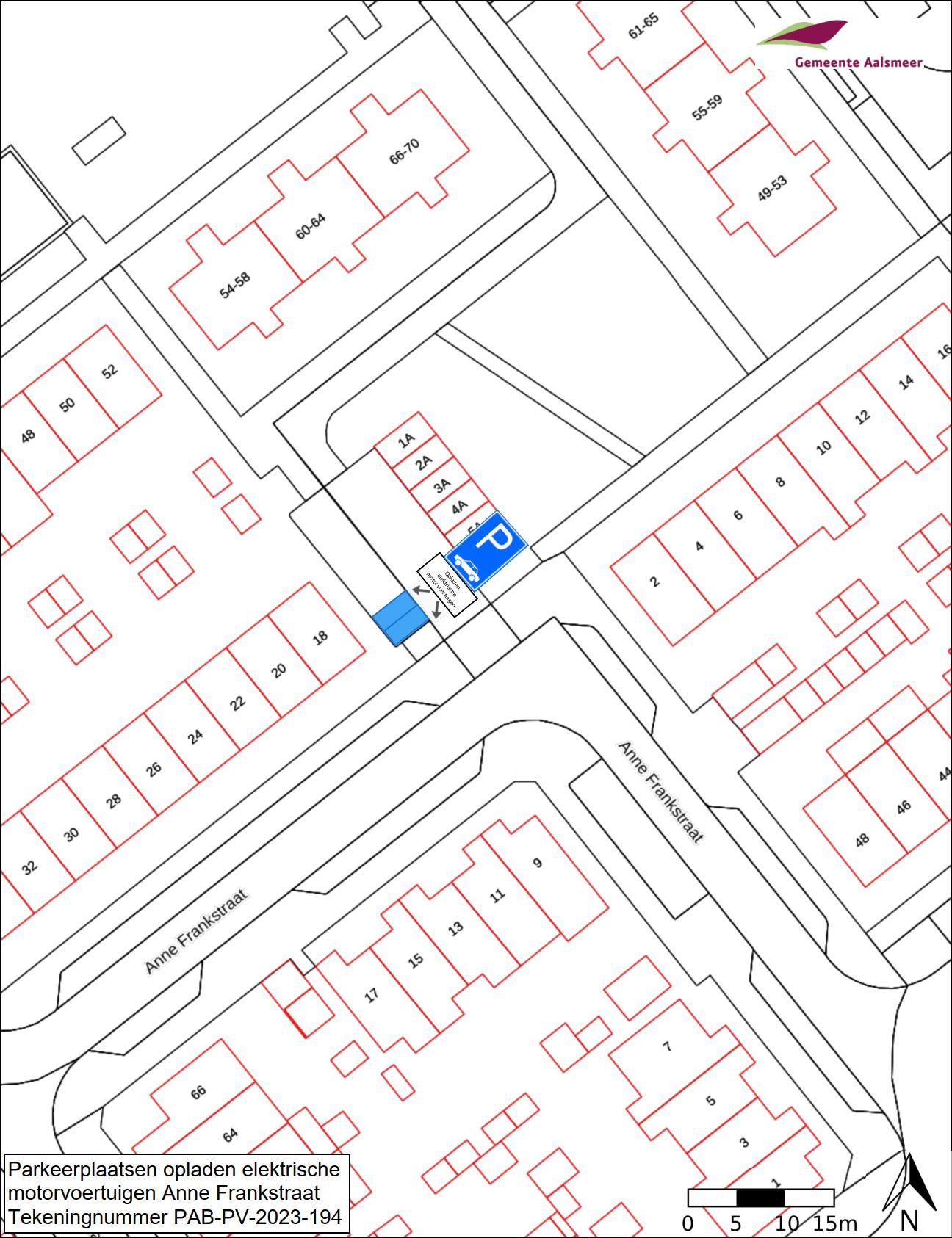 Burgemeester en wethouders van Aalsmeer besluiten om de Anne Frankstraat vier parkeerplaatsen aan te wijzen als parkeerplaats voor het opladen van elektrische motorvoertuigen. De parkeerplaatsen mogen alleen gebruikt worden voor het opladen van deze elektrische motorvoertuigen.