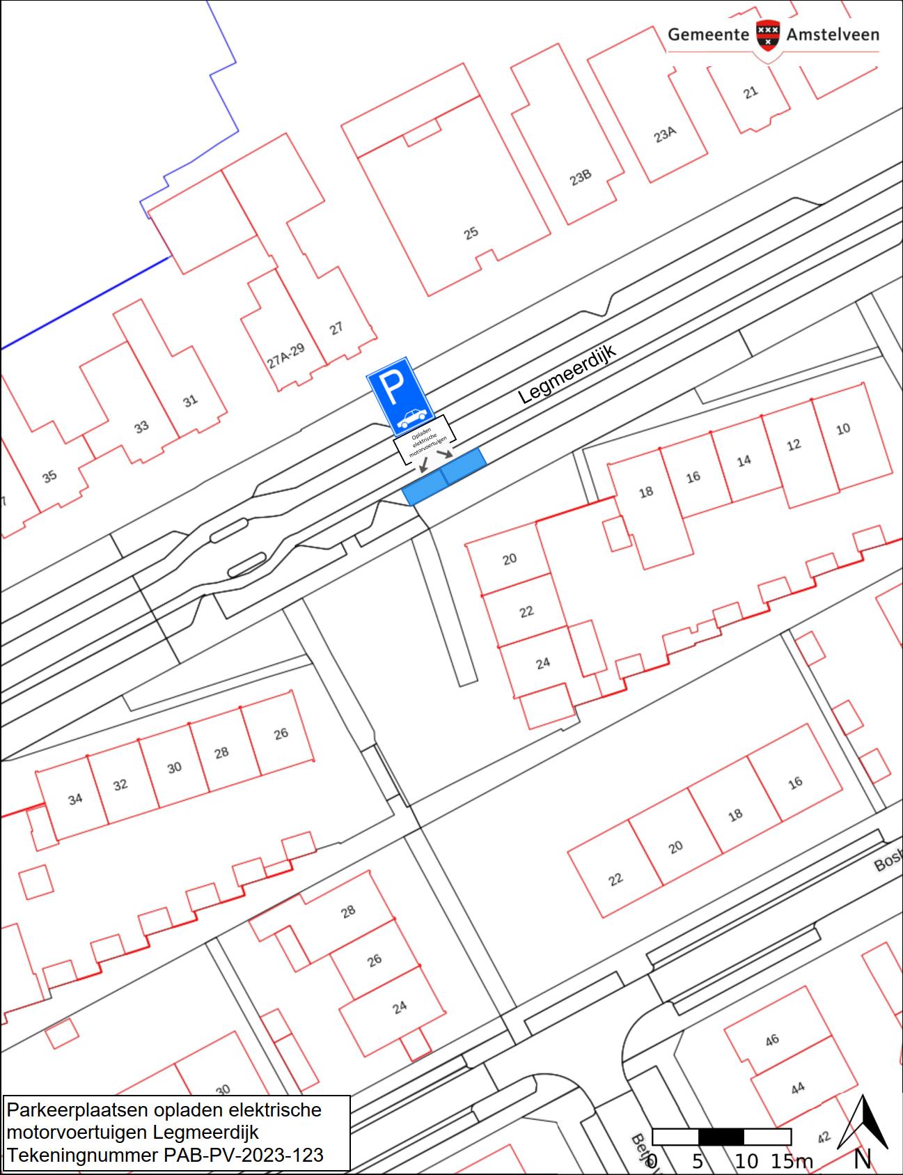 Burgemeester en wethouders van Amstelveen besluiten om aan de Legmeerdijk twee parkeerplaatsen aan te wijzen als parkeerplaats voor het opladen van elektrische motorvoertuigen. De parkeerplaatsen mogen alleen gebruikt worden voor het opladen van deze elektrische motorvoertuigen.