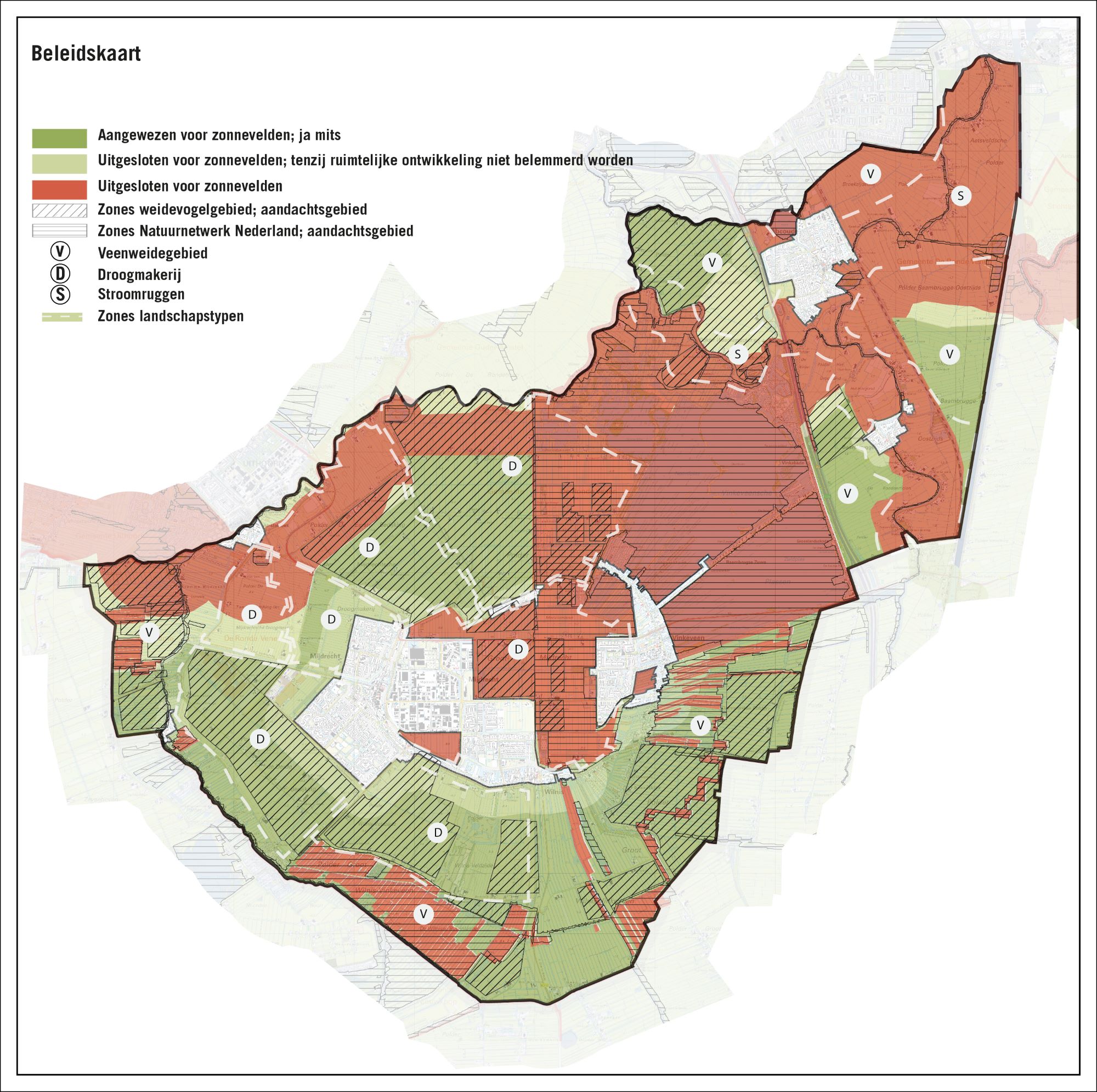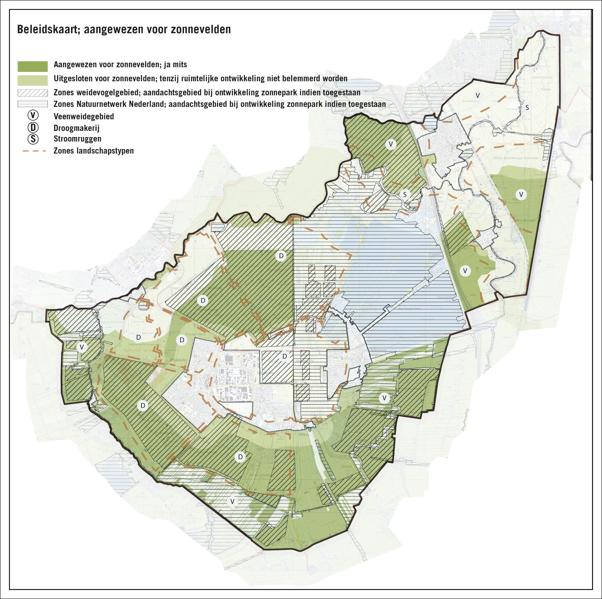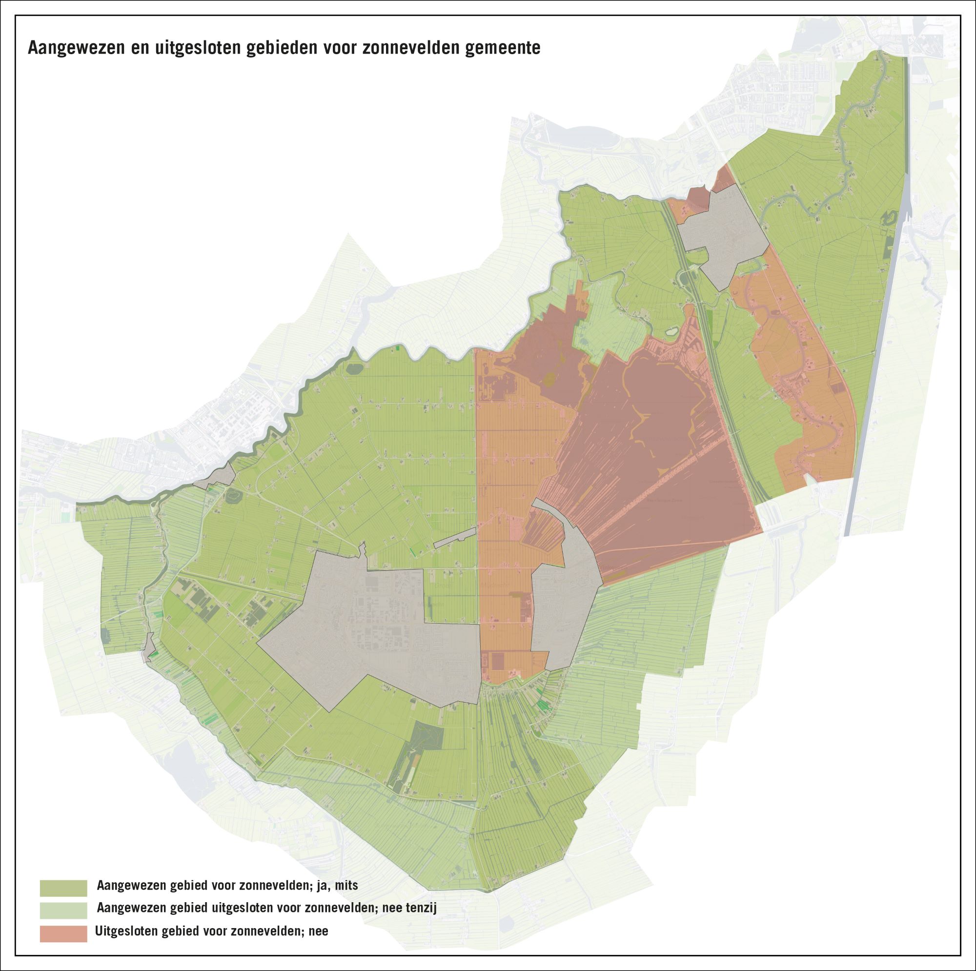 Op de kaart in bijlage 11 en 12 is aangegeven waar binnen de gemeente De Ronde Venen zonnevelden gerealiseerd kunnen worden (ja, mits), waar er mogelijk knelpunten liggen (nee, tenzij) en waar geen mogelijkheden gezien worden om zonnevelden te realiseren (nee).