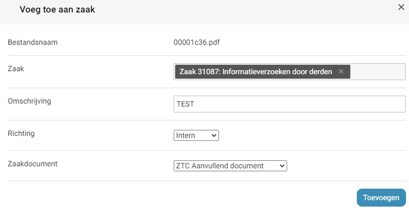 Toevoegen aan een bestaande zaak. Klik naast het document op het pijltje. In dit geval zoek je eerst de zaak op waar je het document aan wil toevoegen. Vul de velden in en let op dat je in het veld Zaakdocument ‘Geen’ vervangt door het goede documenttype. Klik vervolgens op toevoegen om het document aan de zaak toe te voegen