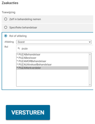 Hierna kom je in het scherm voor de registratie van de zaak. Bij Zaakacties is het belangrijk dat je op de goede manier toewijst: niet aan jezelf en niet aan een specifieke behandelaar maar aan een rol. Voor het toewijzen aan een rol selecteer je eerst de afdeling Soest (de hele organisatie zit onder één afdeling die Soest heet) en selecteer vervolgens de juiste rol. Klik vervolgens op versturen om de registratie af te ronden.