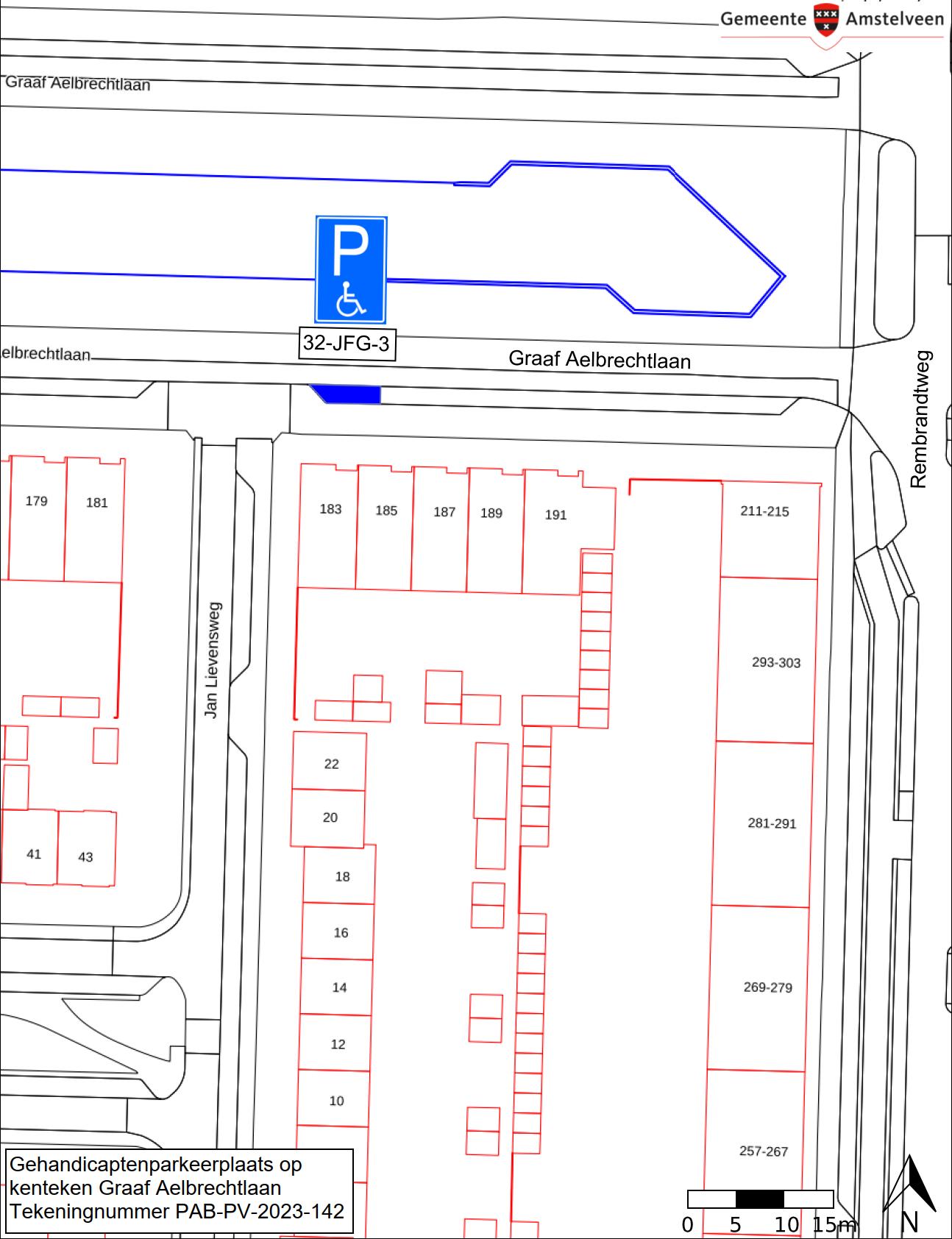 Burgemeester en wethouders van Amstelveen besluiten het parkeren te verbieden op een parkeerplaats in de Graaf Aelbrechtlaan, zoals aangegeven op tekening PAB-PV-2023-142, met uitzondering van het voertuig met het kenteken 32-JFG-3 (gehandicaptenparkeerplaats).