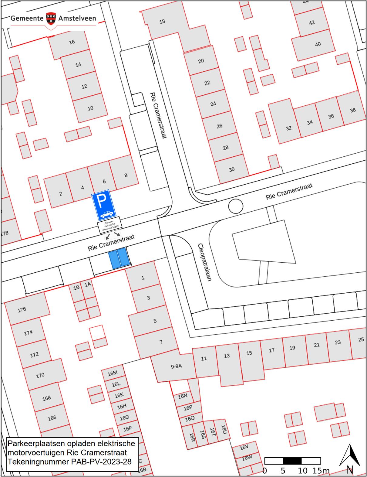 Burgemeester en wethouders van Amstelveen besluiten om hun besluit van 17 maart 2023(zaaknummer Z23-025446), waarbij twee parkeerplaatsen in de Rie Cramerstraat zijn aangewezen als parkeerplaats voor voor het opladen van elektrische motorvoertuigen, in te trekken. De openbare laadpaal is nog niet geplaatst waardoor in de praktijk niets veranderd. De geplande parkeerplaatsen voor het opladen van deze elektrische motorvoertuigen zijn weergegeven op de in dit besluit opgenomen tekening PAB-PV-2023-28.