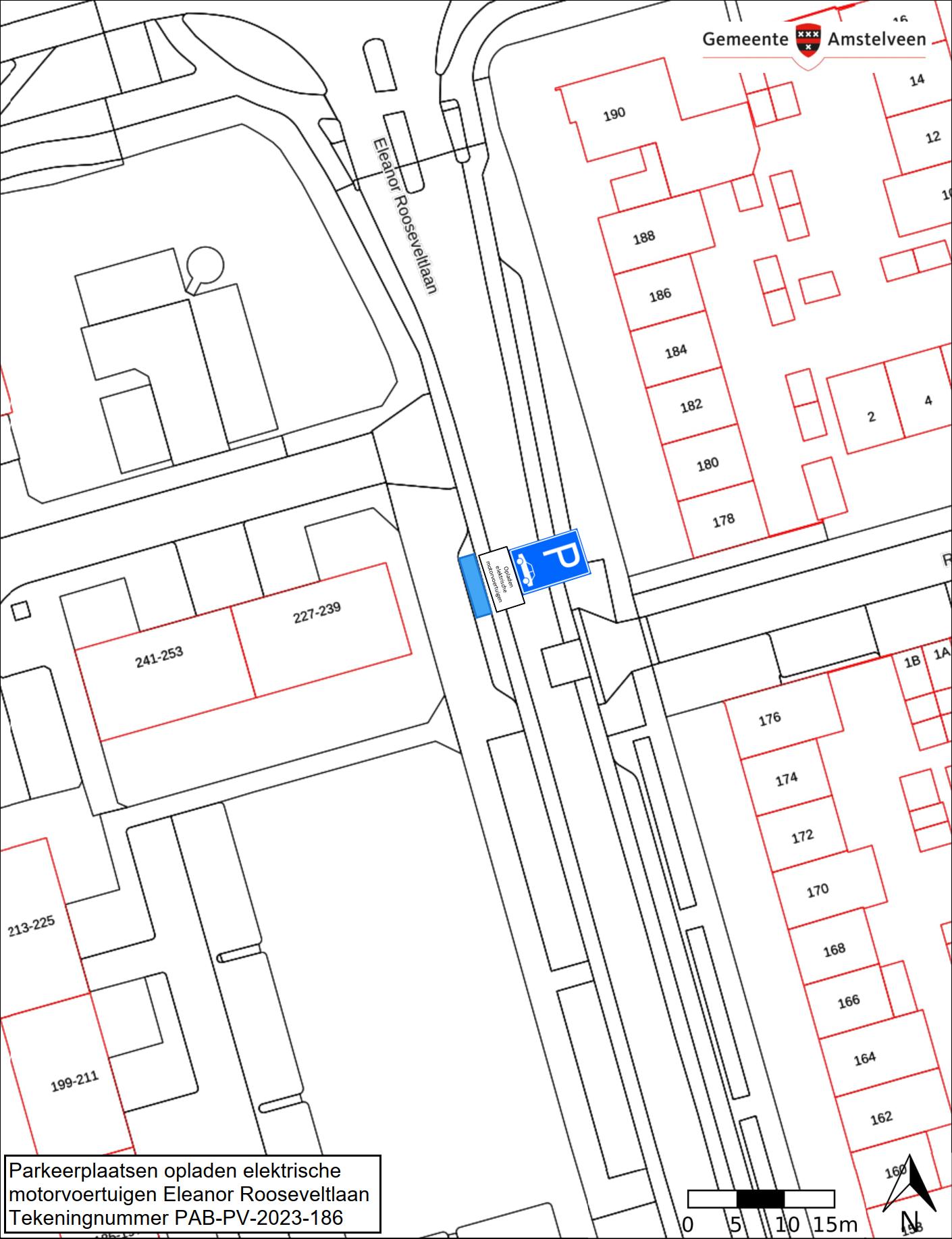 Samen met de laadpaalexploitant is gezocht naar een geschikte alternatieve locatie. Deze locatie is gevonden in de Eleanor Rooseveltlaan en op tekening PAB-PV-2023-186 zichtbaar. Op deze locatie zullen we één parkeerplaats inrichten als parkeerplaats voor het opladen van elektrische motorvoertuigen