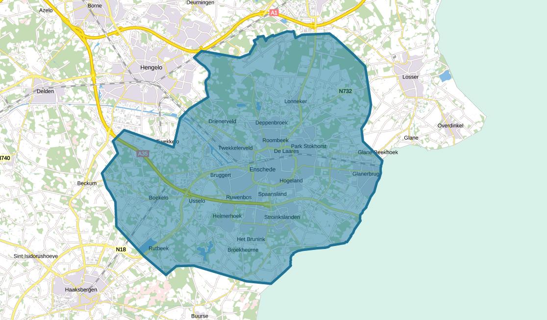 De invalswegen van Enschede, zijnde de A35/N35, de Haaksbergerstraat/N18, de Oldenzaalsestraat, de Weerseloseweg, de Deurningerstraat, de Gronausestraat, de Boulevard 1945 tussen de Oldenzaalsestraat/Mooienhof en Gronausestraat, de Oostweg, de Zuiderval, de Westerval, de Auke Vleerstraat, de Hendrik ter Kuilestraat, de Parkweg (tussen de Westerval en de Lambertus Buddestraat) en de Hengelosestraat, alle straten inclusief op- en afritten en naastgelegen parkeerplaatsen en voor zover gelegen binnen de gemeentegrens.