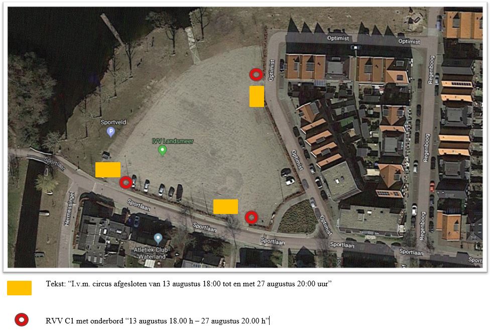 Het parkeerterrein aan de Sportlaan in Landsmeer van zondag 13 augustus 2023 vanaf 18.00 uur tot en met zondag 27 augustus 2023 tot 20.00 uur niet toegankelijk te maken voor auto’s en parkeren niet toe te staan zoals aangegeven in de bij het besluit horende tekening ‘Parkeerterrein Sportlaan – Circuslocatie 2023’.