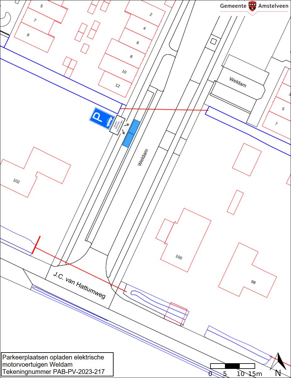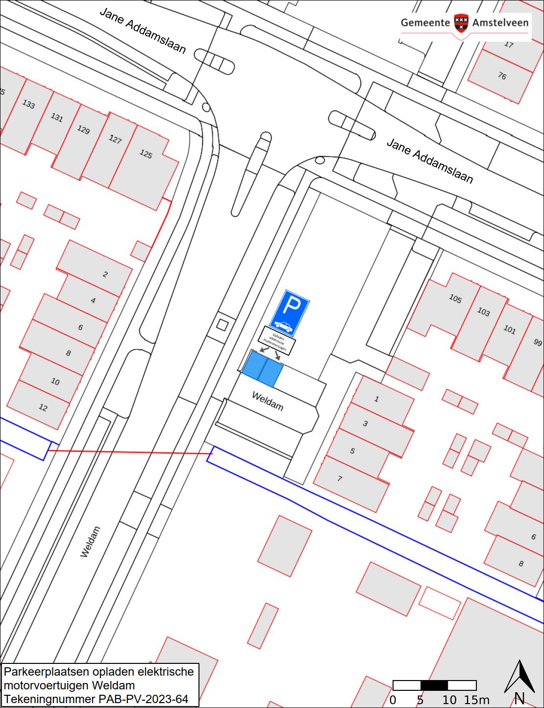 Burgemeester en wethouders van Amstelveen besluiten om hun besluit van 12 juli 2023 (zaaknummer Z23-061795), waarbij twee parkeerplaatsen in de straat Weldam zijn aangewezen als parkeerplaats voor het opladen van elektrische motorvoertuigen, in te trekken. De openbare laadpalen zijn nog niet geplaatst waardoor in de praktijk niets veranderd. De geplande parkeerplaatsen voor het opladen van deze elektrische motorvoertuigen zijn weergegeven op de in dit besluit opgenomen tekening PAB-PV-2023-64.
