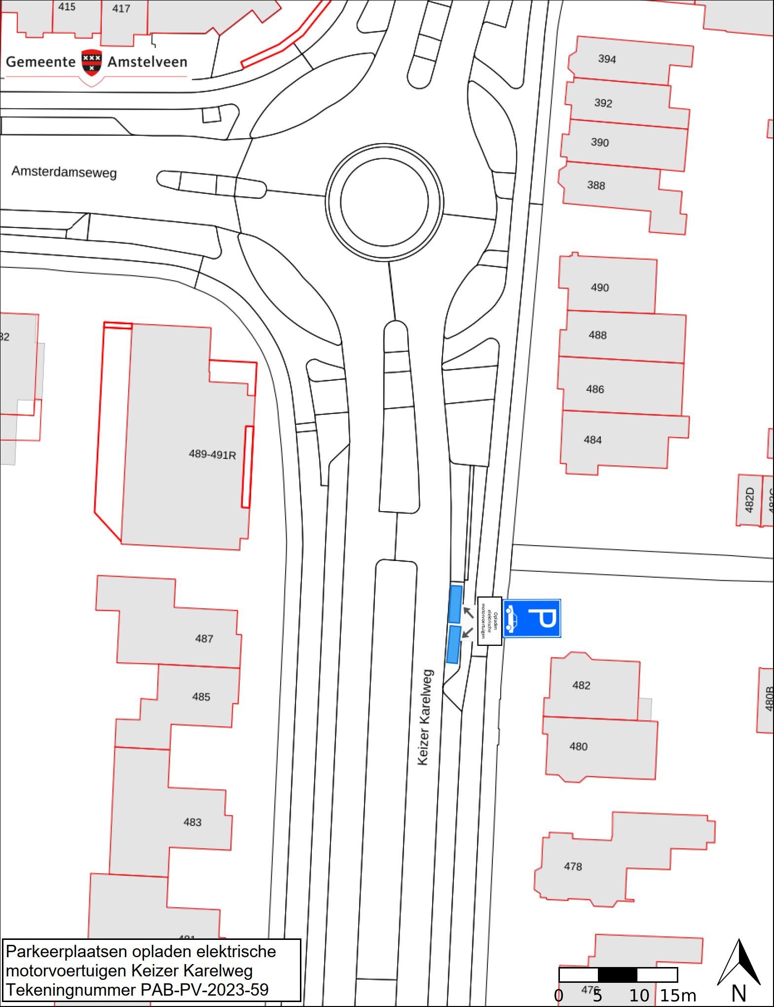 Burgemeester en wethouders van Amstelveen besluiten om hun besluit van 5 juli 2023(zaaknummer Z23-057971), waarbij twee parkeerplaatsen in de Keizer Karelweg zijn aangewezen als parkeerplaats voor het opladen van elektrische motorvoertuigen, in te trekken. De openbare laadpaal is nog niet geplaatst waardoor in de praktijk niets veranderd. De geplande parkeerplaatsen voor het opladen van deze elektrische motorvoertuigen zijn weergegeven op de in dit besluit opgenomen tekening PAB-PV-2023-59.
