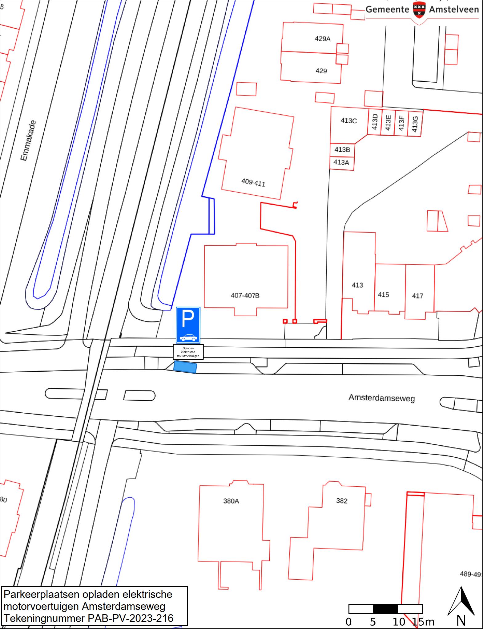 Burgemeester en wethouders van Amstelveen besluiten daarnaast om één parkeerplaats aan te wijzen als parkeerplaats aan de Amsterdamseweg voor het opladen van elektrische motorvoertuigen. Deze parkeerplaats mag alleen gebruikt worden voor het opladen van elektrische motorvoertuigen.