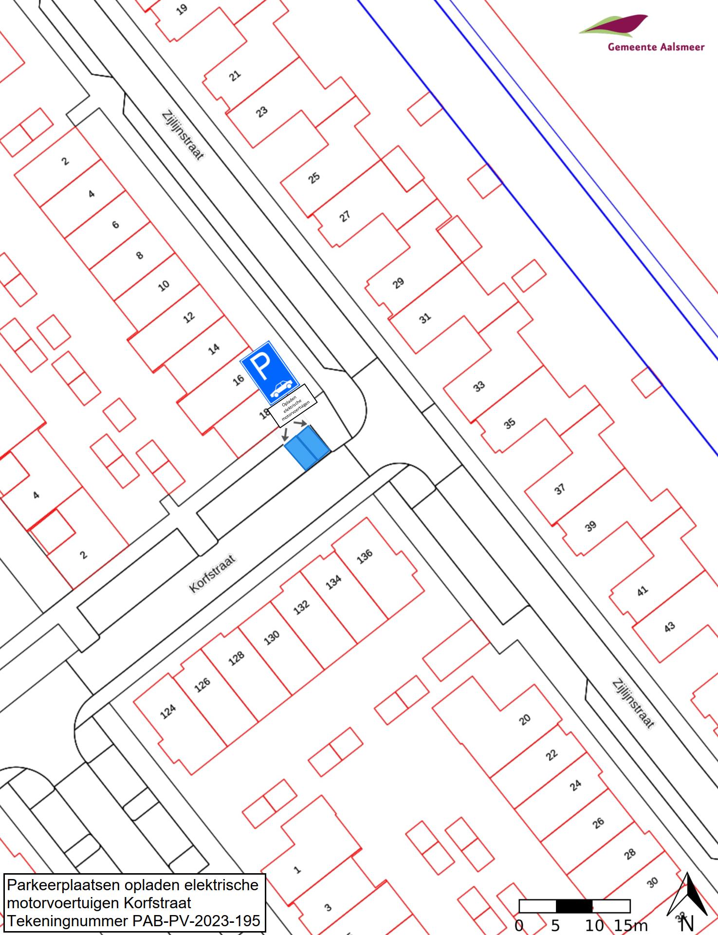 Burgemeester en wethouders van Aalsmeer besluiten om in de Korfstraat twee parkeerplaatsen aan te wijzen als parkeerplaats voor het opladen van elektrische motorvoertuigen. De parkeerplaatsen mogen alleen gebruikt worden voor het opladen van deze elektrische motorvoertuigen.