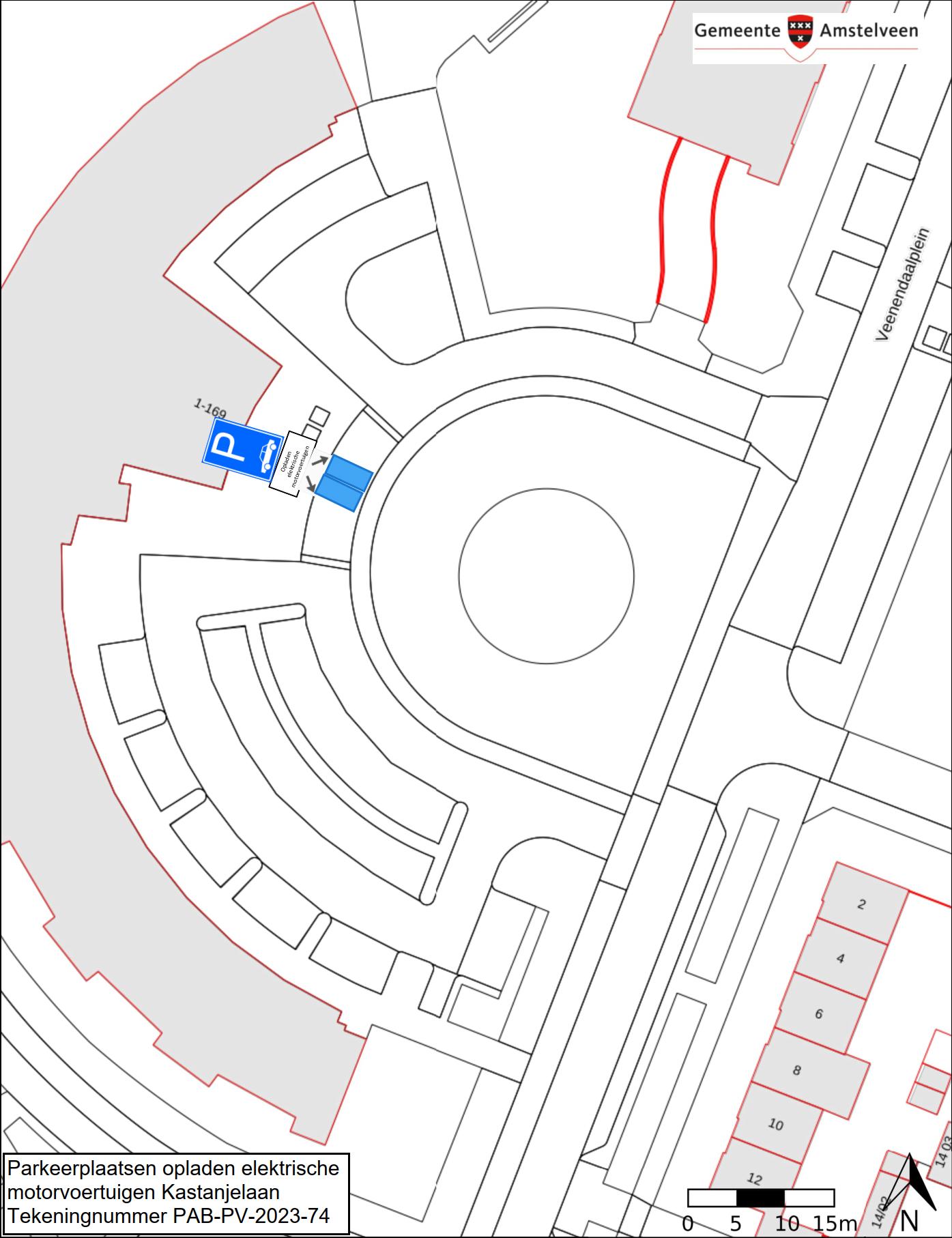 Burgemeester en wethouders van Amstelveen besluiten om in de Kastanjelaan twee parkeerplaatsen aan te wijzen als parkeerplaats voor het opladen van elektrische motorvoertuigen. De parkeerplaatsen mogen alleen gebruikt worden voor het opladen van deze elektrische motorvoertuigen.