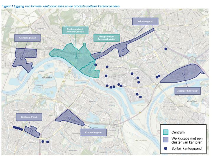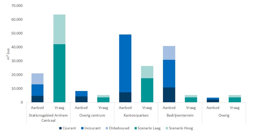 Over alle kantoorlocaties in Arnhem bezien is er echter nog steeds sprake van een aanzienlijk kwantitatief overaanbod. De totale vraag bedraagt 70.000 m² tot 106.000 m². Het aanbod telt op tot ruim 123.000 m². Het is daarom – naast het behouden, versterken en toevoegen van toekomstbestendige kantoor-ruimte – nog steeds nodig om door middel van transformatie (functieverandering) incourant aanbod op ongeschikte locaties uit de markt te halen en/of voor een andere economische functie te benutten.