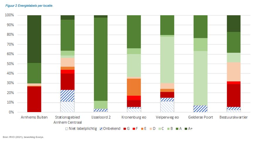 Vanaf 1 januari 2023 moeten kantoren verplicht een energielabel C of beter hebben. De ambitie ligt echter hoger. Gemeente Arnhem wil dat er in 2030 alleen nog maar kantoren met minimaal energielabel A zijn. Daarbij wordt bij renovatie gestimuleerd zoveel mogelijk richting label A+++ te renoveren, conform de renovatiestandaard. Die kantoren liggen dan op werklocaties die groen, duurzaam en toekomstbestendig zijn. De taak van de gemeente is om te informeren, stimuleren, reguleren en controleren. Van bedrijven en instellingen wordt verwacht dat zij bijdragen aan een duurzame toekomst door te investeren in het verduurzamen van panden, de percelen en de bedrijfsprocessen.