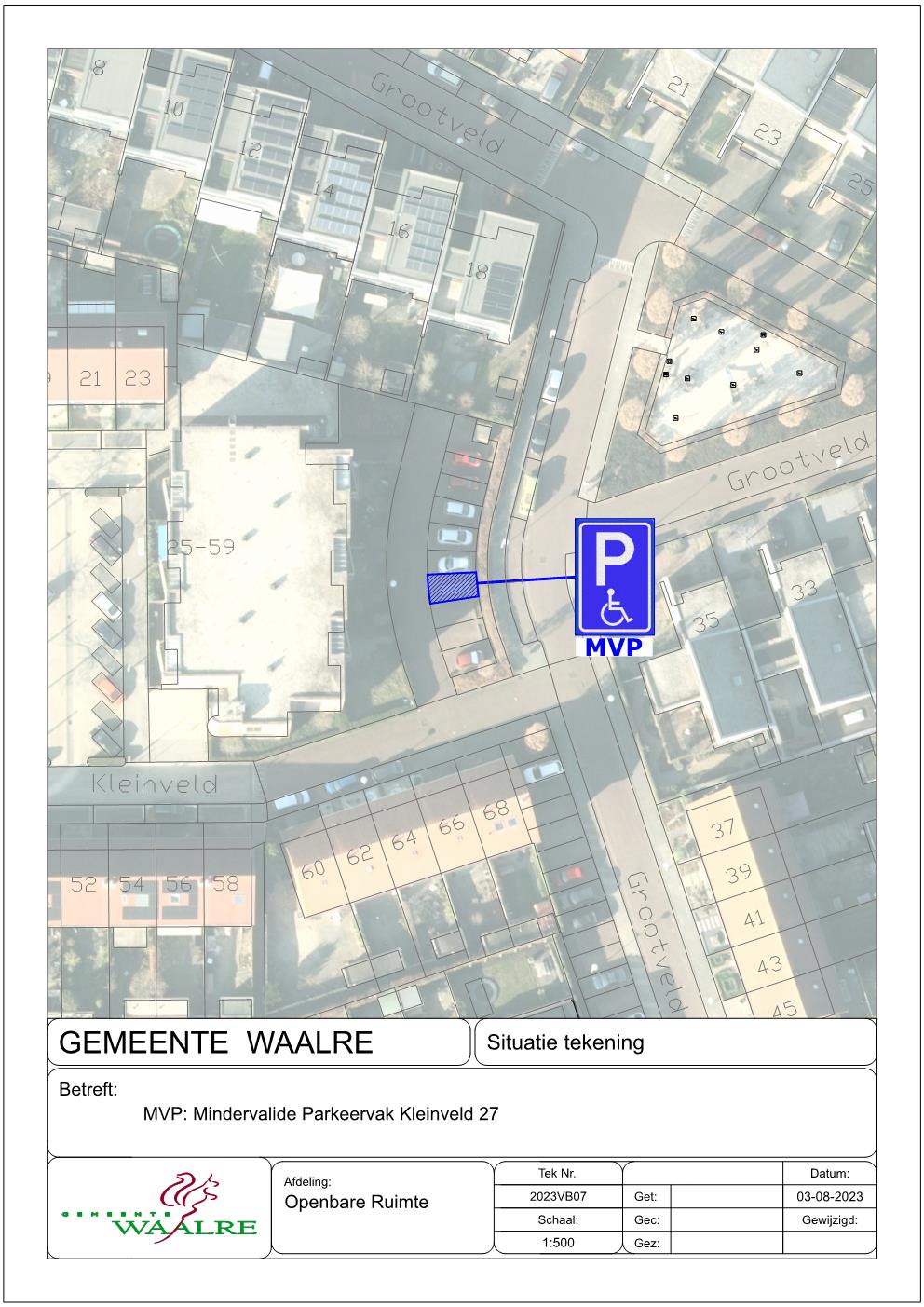 Verkeersbesluit voor het aanwijzen van een gehandicaptenparkeerplaats in het Kleinveld, ter hoogte van nr. 27