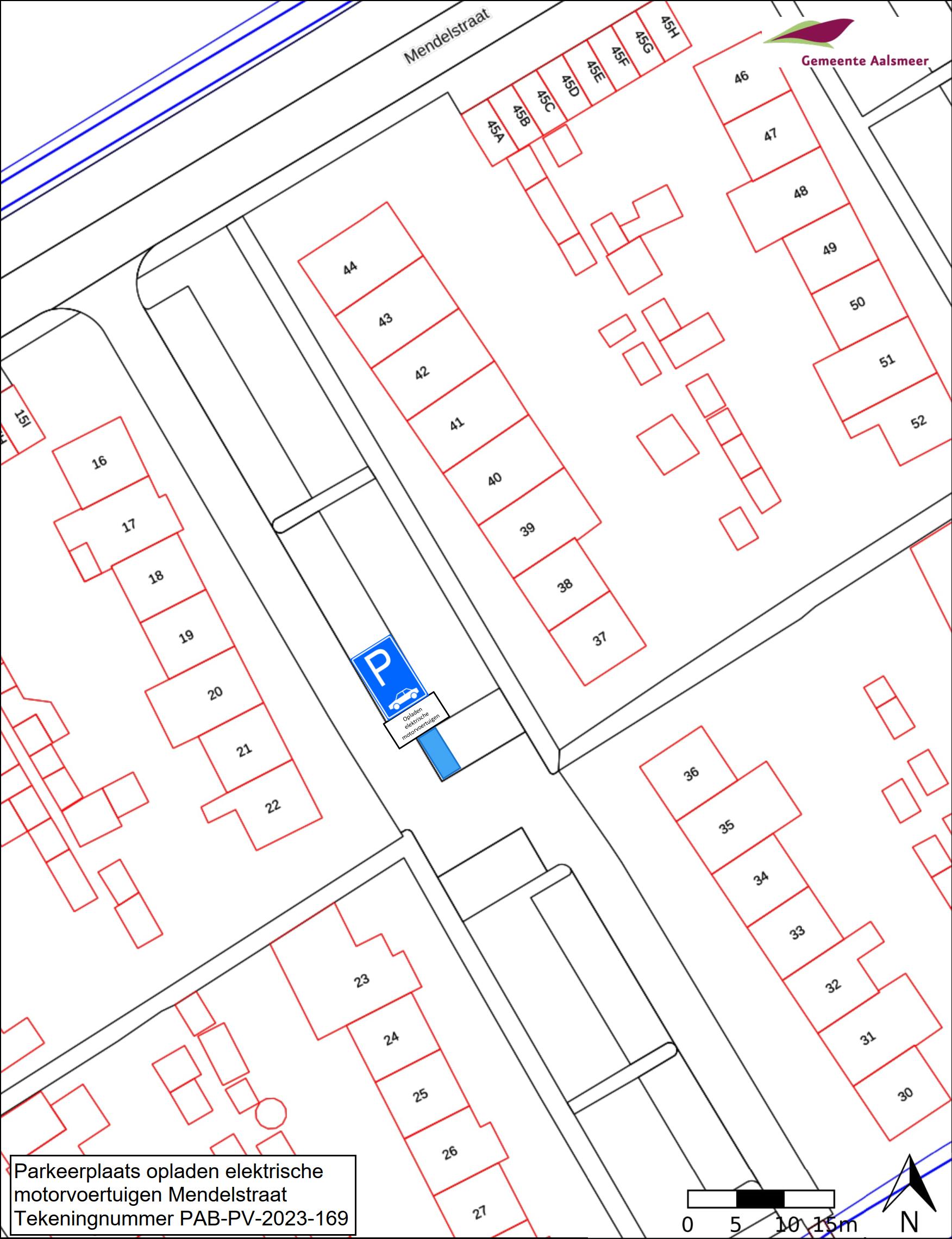 Burgemeester en wethouders van Aalsmeer besluiten om in de Mendelstraat één parkeerplaats aan te wijzen als parkeerplaats voor het opladen van elektrische motorvoertuigen. De parkeerplaats mag alleen gebruikt worden voor het opladen van deze elektrische motorvoertuigen.
