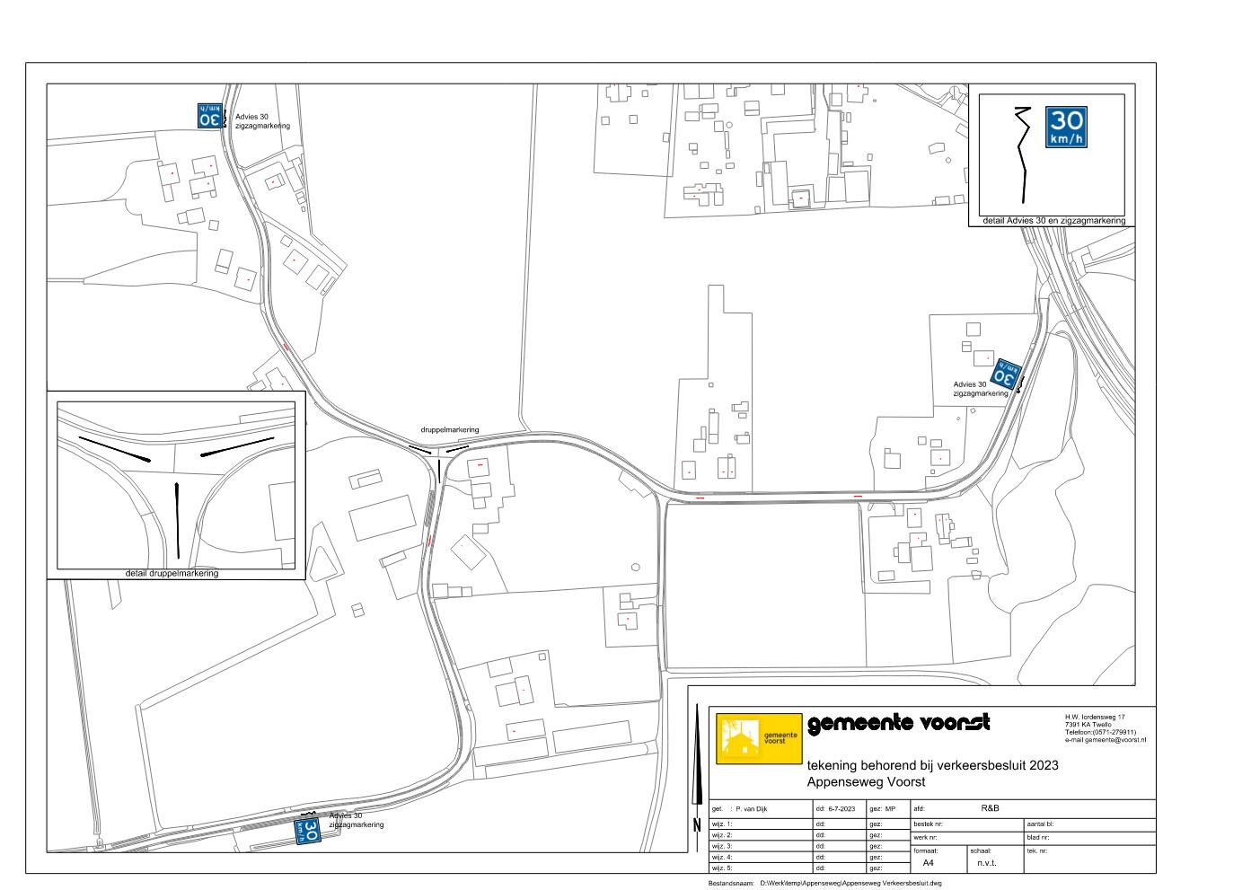 ter plaatse van het deel van de Appenseweg en het deel van de Watergatstraat in Voorst dat op de bij dit besluit behorende bebordingstekening van 6 juli 2023 is aangegeven, een adviessnelheid van 30 km/u in te stellen met het plaatsen van verkeersborden A04 met de aanduiding '30' als bedoeld in bijlage I van het Reglement verkeersregels en verkeerstekens 1990.