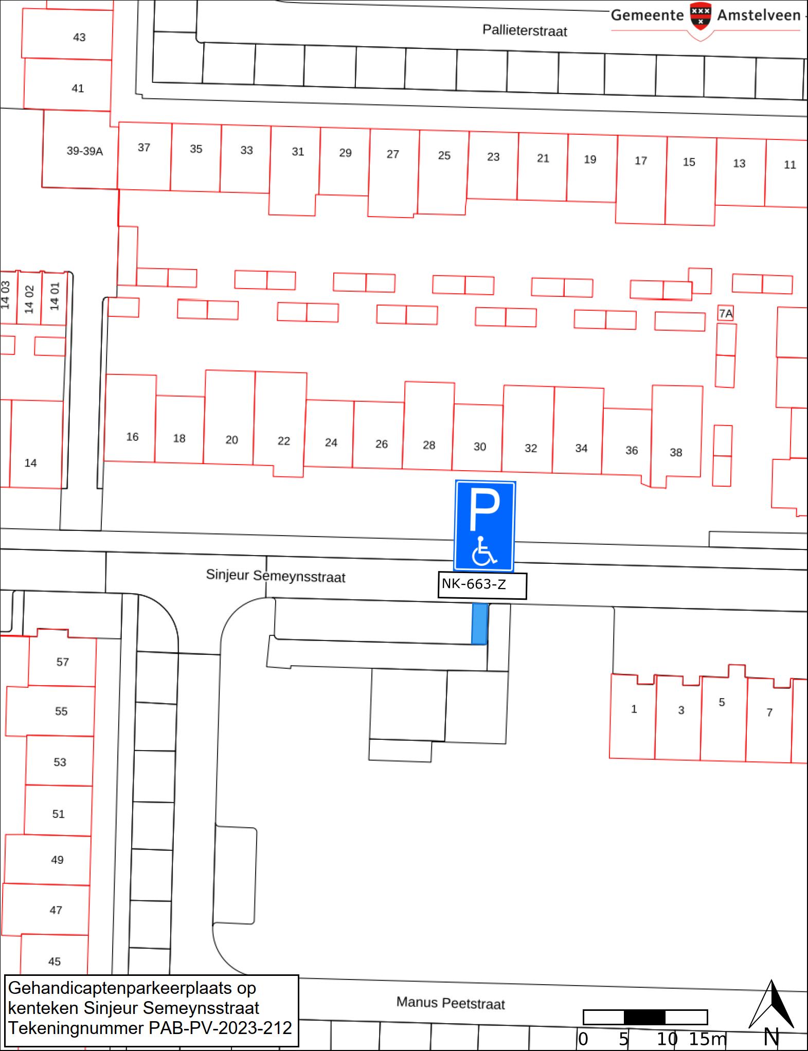 Burgemeester en wethouders van Amstelveen besluiten het parkeren te verbieden op een parkeerplaats in de Sinjeur Semeynsstraat, zoals aangegeven op tekening PAB-PV-2023-212, met uitzondering van het voertuig met het kenteken NK-663-Z (gehandicaptenparkeerplaats).