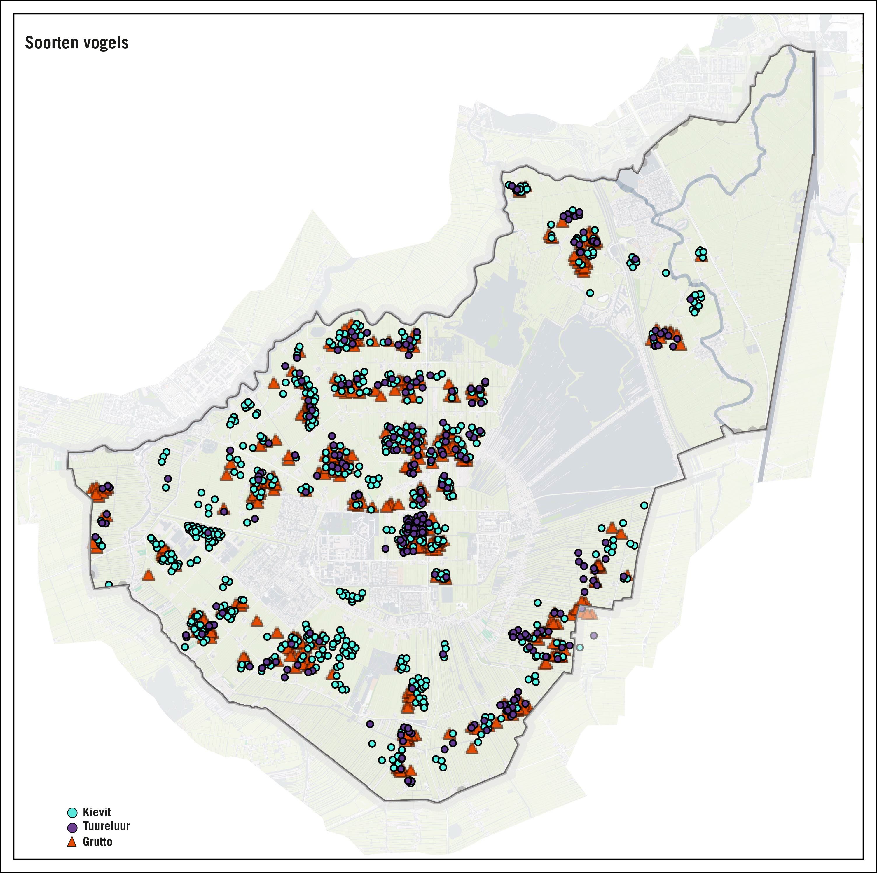 Op bijlage 5 is aangegeven waar de meeste populaties grutto’s, kieviten en tureluurs voorkomen.
