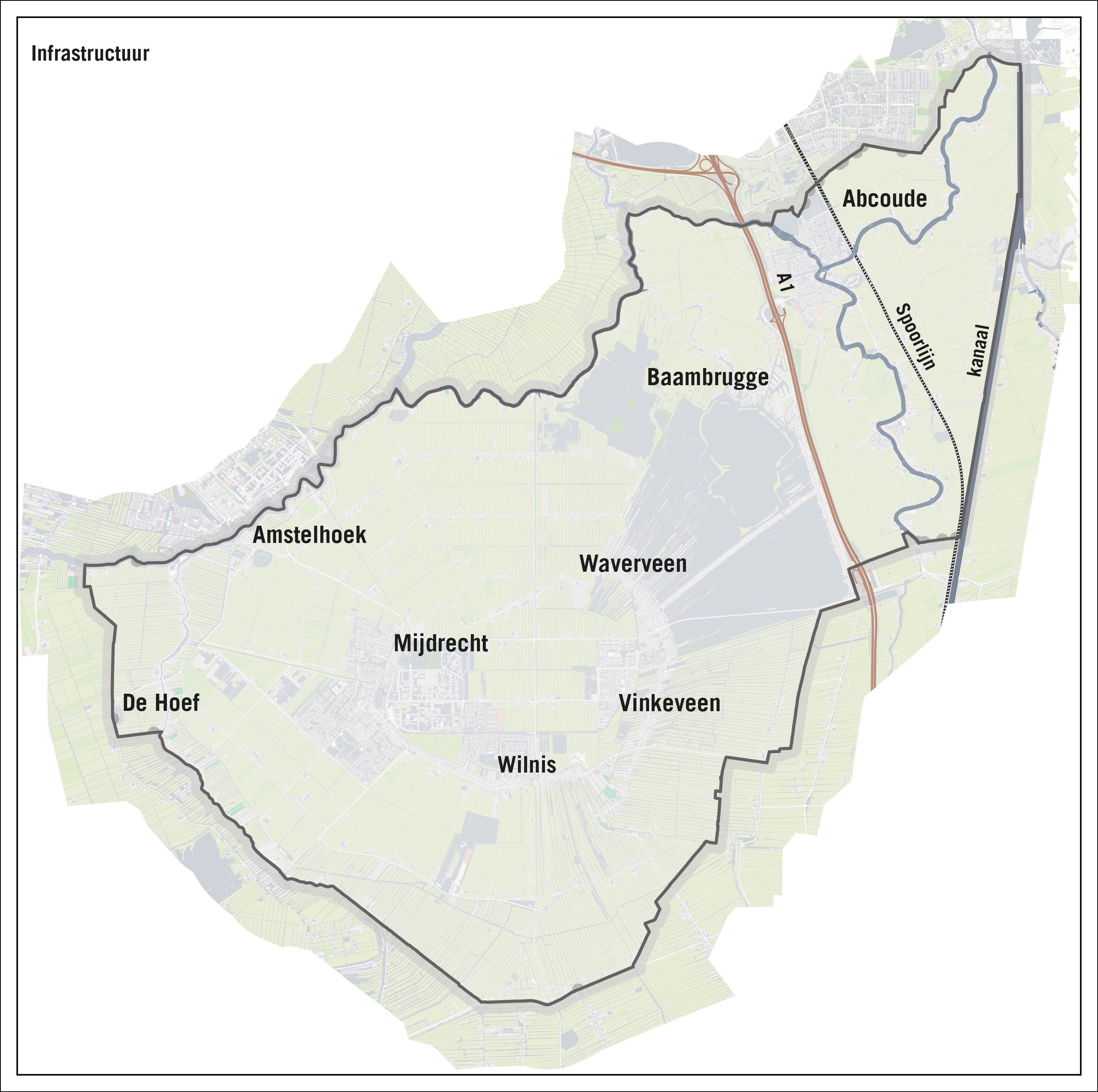 Grote infrastructurele werken zijn vooral in de noordoost hoek van de gemeente te vinden; de snelweg A2, de spoorlijn tussen Amsterdam en Utrecht en het Amsterdam-Rijnkanaal (zie bijlage 10). Met name vanaf de eerste twee zijn er verre zichtlijnen over het landschap van De Ronde Venen.