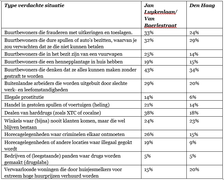 In de regel geldt dat nagenoeg alle verdachte situaties vaker worden ervaren in de Jan Luykenlaan/Van Baerlestaat wanneer afgezet tegen het gemeentelijk gemiddelde (zie tabel 1). Alleen de aanwezigheid van drugslabs en verwaarloosde woningen die door huisjesmelkers voor extreem hoge huurprijzen verhuurd worden komen even vaak of minder voor wanneer vergeleken met heel Den Haag. Opvallend grote verschillen zijn zichtbaar bij de mogelijke aanwezigheid van illegale prostitutie, het dealen van harddrugs en illegaal gokken.