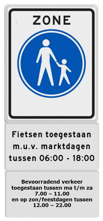 Het is dan ook gewenst om het combinatiebord te verwijderen. En het bord G07zb met onderbord “Fietsen toegestaan m.u.v. marktdagen tussen 06:00 – 18:00” en onderbord “Bevoorradend verkeer toegestaan tussen ma t/m za 7.00 – 11.00 en op zon/feestdagen tussen 12.00 – 22.00” te plaatsen. Het ontwerp van deze borden is terug te vinden in de bijlage van dit besluit.