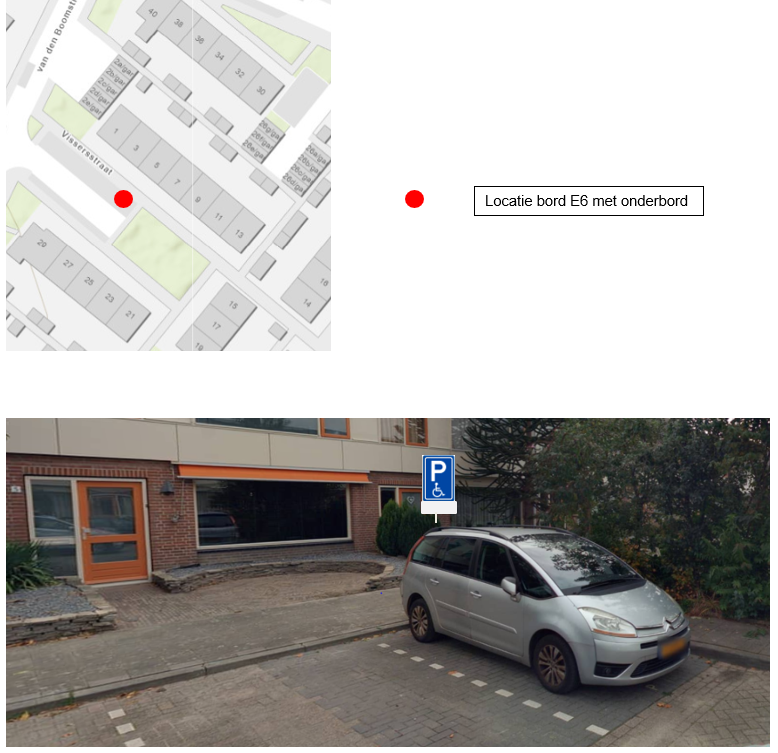 het vaststellen van een gereserveerde gehandicaptenparkeerplaats nabij Vissersstraat 25 te Eersel, door middel van het plaatsen van verkeersbord E6 van bijlage 1 van het Reglement Verkeersregels en Verkeerstekens 1990 en onderbord model OB309, zoals op onderstaande tekening staat aangegeven.