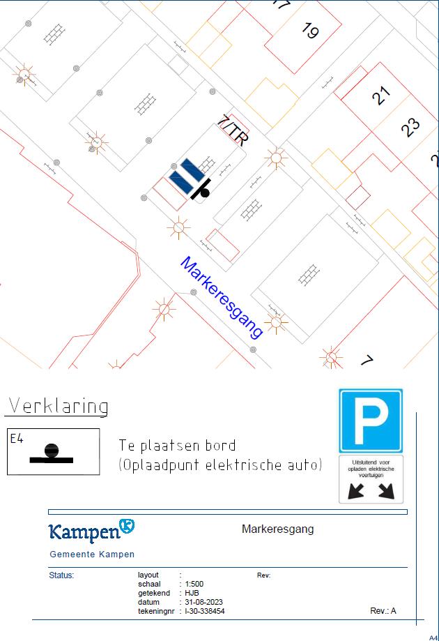 - door middel van het plaatsen van het verkeersbord E4 van bijlage 1 van het RVV 1990 met een onderbord met de tekst ‘opladen elektrische voertuigen’ – en een onderbord met pijlen, waaruit blijkt dat het bord voor twee parkeerplaatsen van toepassing is- op de Markeresgang ter hoogte van nummer 7-TR, een tweetal parkeerplaatsen te reserveren ten behoeve van het opladen van elektrische voertuigen.