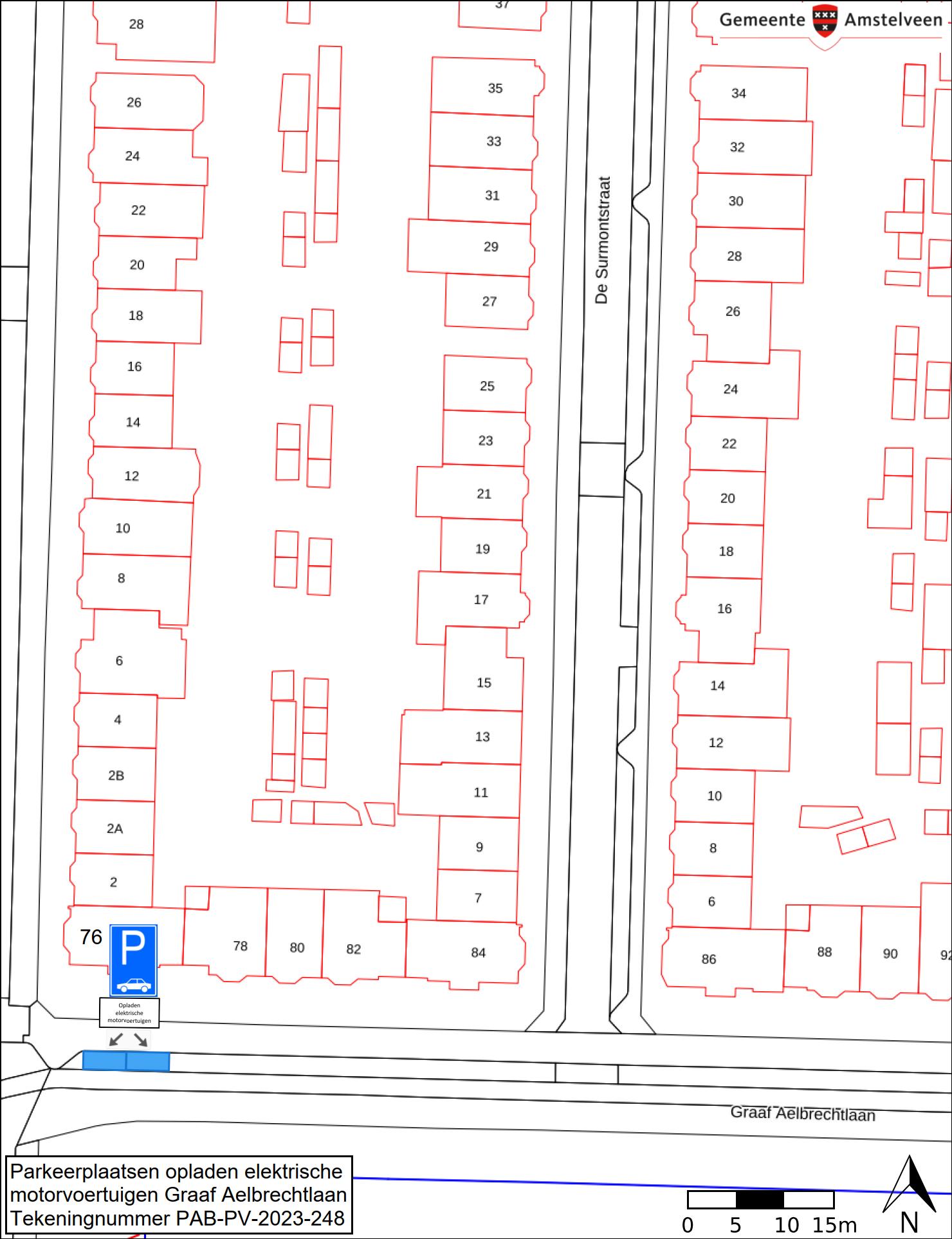 Burgemeester en wethouders van Amstelveen besluiten om in de Graaf Aelbrechtlaan twee parkeerplaatsen aan te wijzen als parkeerplaats voor het opladen van elektrische motorvoertuigen. De parkeerplaatsen mogen alleen gebruikt worden voor het opladen van deze elektrische motorvoertuigen.