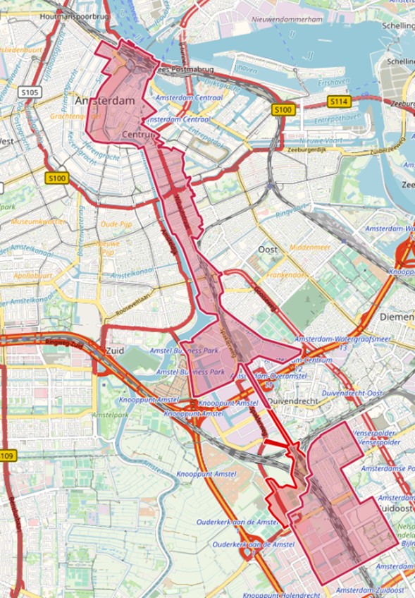 het gebied begrensd door de Holterbergweg, De Loper, de gemeentegrens bij de spoorbaan Amsterdam-Utrecht, Stationsplein, Stationsweg, Holterbergweg, Parkeerterrein P2, Parkeerterrein P-Bus, Parkeerterrein P-Plus en de spoor/metrolijn vanaf station Duivendrecht tot aan de gemeentegrens met Amsterdam.
