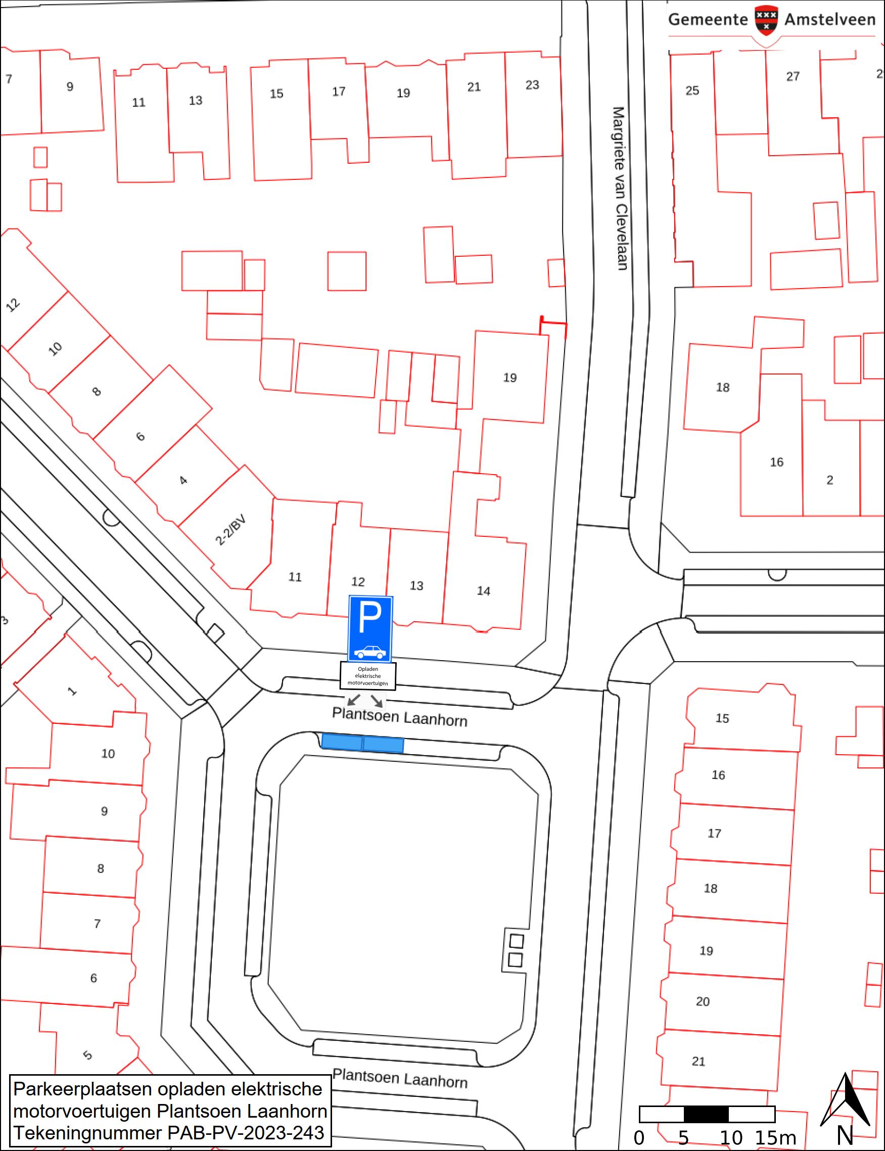 Burgemeester en wethouders van Amstelveen besluiten daarnaast om twee parkeerplaatsen in de Plantsoen Laanhorn aan te wijzen als parkeerplaatsen voor het opladen van elektrische motorvoertuigen. Deze parkeerplaats mag alleen gebruikt worden voor het opladen van elektrische motorvoertuigen.