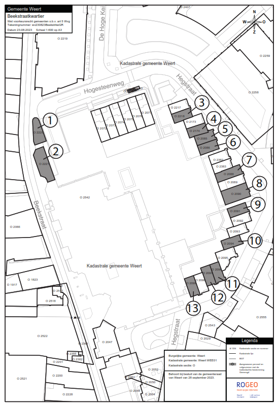 Het betreft de kadastrale percelen Weert sectie O nummers 2220, 2221, 2218, 2174, 2085, 2086, 2088, 2090, 2091, 2094, 2096, 2097 en 2099. Deze percelen zijn gelegen in de Beekstraat en de Hegstraat in Weert. De eigenaren ontvangen per brief het aanwijzingsbesluit met nadere informatie.