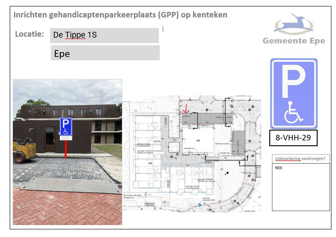 dat in het belang van de mobiliteit van gehandicapte het noodzakelijk c.q. gewenst wordt geacht bij het volgende pand een gehandicaptenparkeerplaats op kenteken aan te leggen: De Tippe 1S te Epe;