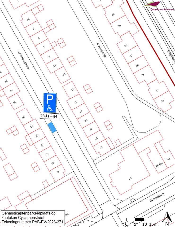 Burgemeester en wethouders van Aalsmeer besluiten het parkeren te verbieden op een parkeerplaats in de Cyclamenstraat, zoals aangegeven op tekening PAB-PV-2023-271, met uitzondering van het voertuig met het kenteken 13-LF-KN (gehandicaptenparkeerplaats).