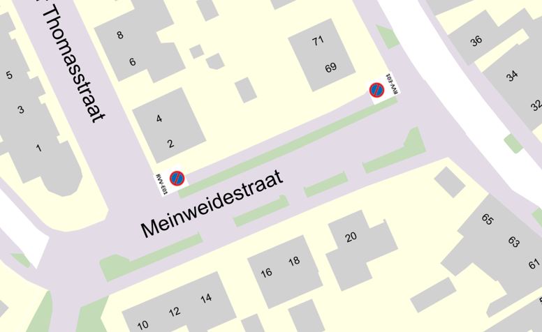 dat er aan de zuidzijde van Meiveldstraat (tussen Meuserstraat en Rector Thomasstraat) diverse inritten en langsparkeerplaatsen zijn gesitueerd;