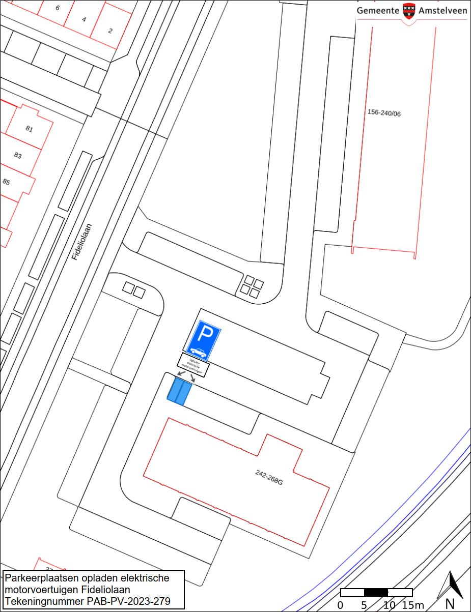 Burgemeester en wethouders van Amstelveen besluiten om in de Straat Fideliolaan twee parkeerplaatsen aan te wijzen als parkeerplaats voor het opladen van elektrische motorvoertuigen. De parkeerplaatsen mogen alleen gebruikt worden voor het opladen van deze elektrische motorvoertuigen.