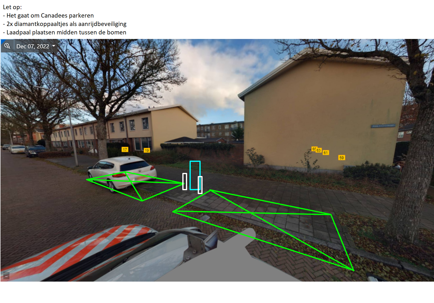 de parkeerplaatsen naast de oplaadpaal zich derhalve half op het trottoir bevinden, en er sprake is van Canadees parkeren;
