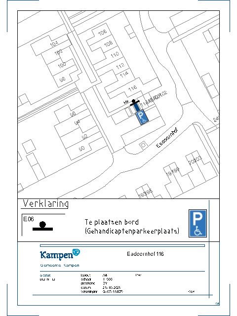 - nabij de Esdoornhof 116 in Kampen één openbare parkeerplaats aan te wijzen als gehandicaptenparkeerplaats op kenteken door het plaatsen van een verkeersbord conform het model E6 van bijlage 1 RVV 1990 inclusief onderbord met het kenteken van het voertuig;