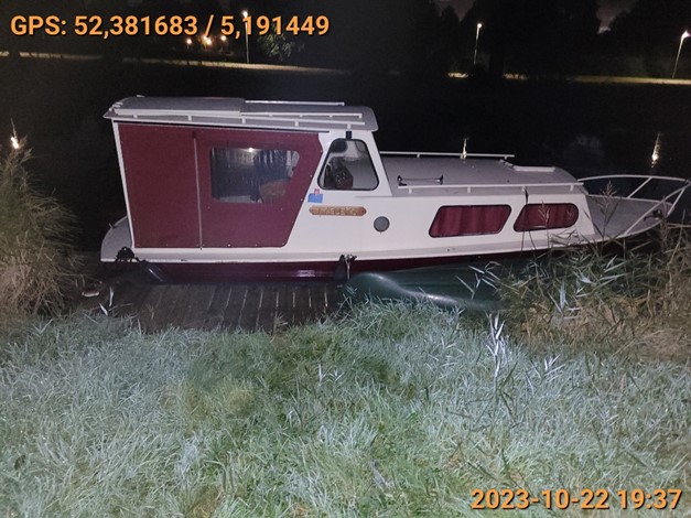 Bestuursrechtelijke handhaving openbare ruimte gemeente Almere voor een wit met bordeauxrood geschakeerde kajuitboot genaamd Misueño aan Nimfkruidstraat te Almere