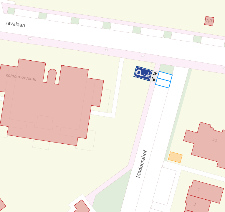 Door middel van het plaatsen van verkeersbord E8c –“Parkeergelegenheid alleen bestemd voor het opladen van elektrische voertuigen”– van Bijlage 1 van het RVV-1990 met onderbord OB504 met twee pijlen schuin naar links- en rechtsonder, twee parkeerplaatsen op de Madoerahof, ter hoogte van de Javalaan, zoals aangeduid in het onderstaande situatieoverzicht, aan te wijzen als parkeergelegenheid alleen bestemd voor elektrische voertuigen met gebruik van de laadpaal.