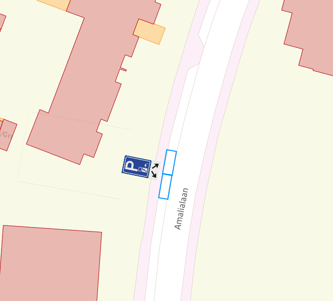Door middel van het plaatsen van verkeersbord E8c –“Parkeergelegenheid alleen bestemd voor het opladen van elektrische voertuigen”– van Bijlage 1 van het RVV-1990 met onderbord OB504 met twee pijlen schuin naar links- en rechtsonder, twee parkeerplaatsen op de Amalialaan, ter hoogte van huisnummer 32, zoals aangeduid in het onderstaande situatieoverzicht, aan te wijzen als parkeergelegenheid alleen bestemd voor elektrische voertuigen met gebruik van de laadpaal.