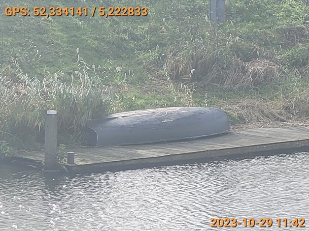 Bestuursrechtelijke handhaving openbare ruimte gemeente Almere voor een donker gekleurd roeibootje op een aanlegsteiger aan de overkant van Sluis 80 te Almere