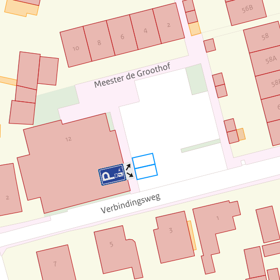 Door middel van het plaatsen van verkeersbord E8c –“Parkeergelegenheid alleen bestemd voor het opladen van elektrische voertuigen”– van Bijlage 1 van het RVV-1990 met onderbord OB504 met twee pijlen schuin naar links- en rechtsonder, twee parkeerplaatsen op de Meester de Groothof nabij nummer 12, zoals aangeduid in het onderstaande situatieoverzicht, aan te wijzen als parkeergelegenheid alleen bestemd voor elektrische voertuigen met gebruik van de laadpaal.