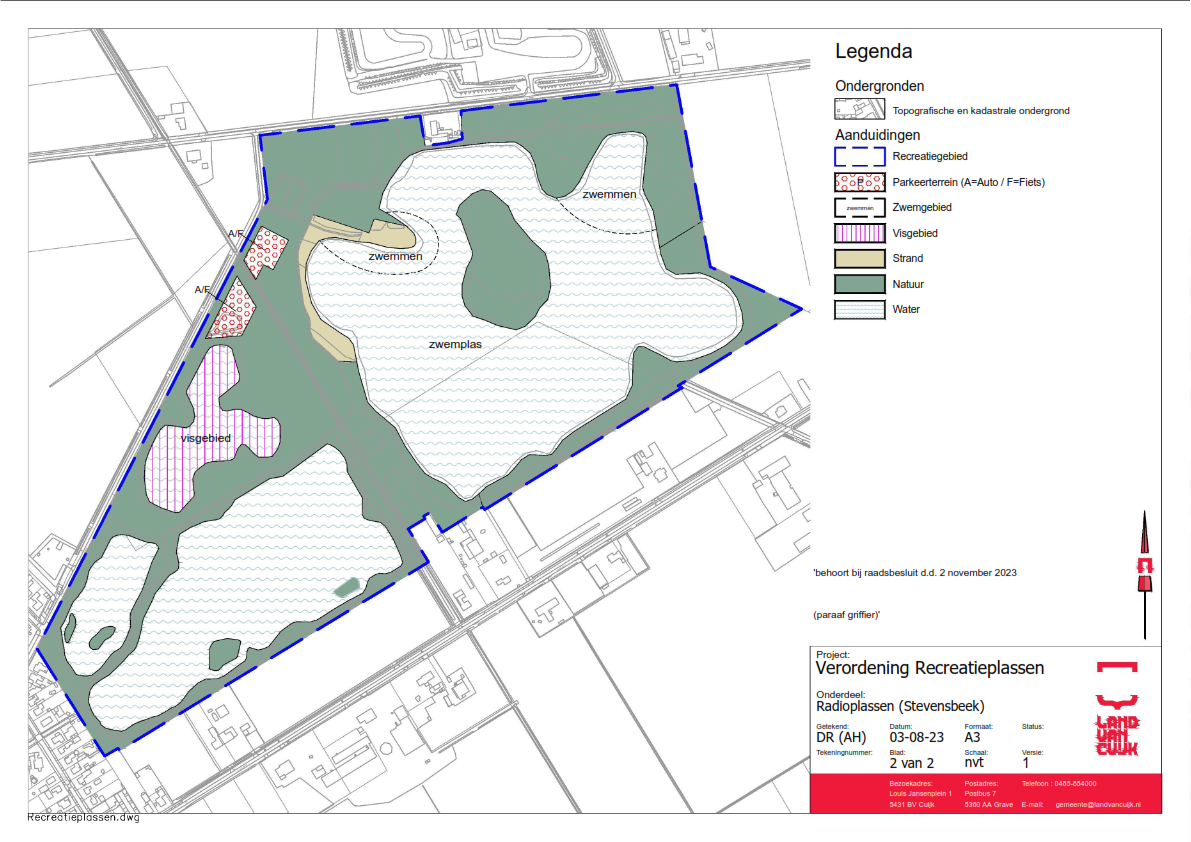 De ‘Verordening Recreatieplassen De Kuilen en Radioplassen Land van Cuijk 2023’ is een beleidsarme harmonisatie van Verordening De Kuilen 2020 (te Mill en Langenboom) en Verordening Recreatiegebied Radioplassen te Stevensbeek 1998.