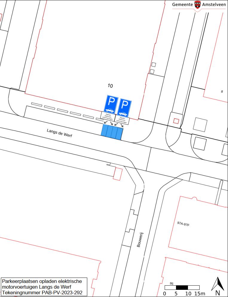 Burgemeester en wethouders van Amstelveen besluiten om in de straat Langs de Werf vier parkeerplaatsen aan te wijzen als parkeerplaats voor het opladen van elektrische motorvoertuigen. De parkeerplaatsen mogen alleen gebruikt worden voor het opladen van deze elektrische motorvoertuigen.