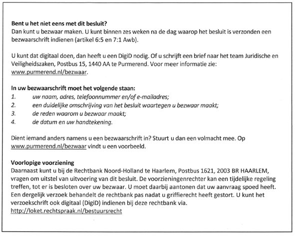 • dat de burgemeester overeenkomstig artikel 151c van de Gemeentewet en op basis van artikel 2:77 van de Algemene plaatselijke verordening Purmerend 2021 kan besluiten tot het plaatsen van camera’s voor een bepaalde duur ten behoeve van het toezicht op een openbare plaats in het kader van de handhaving van de openbare orde;