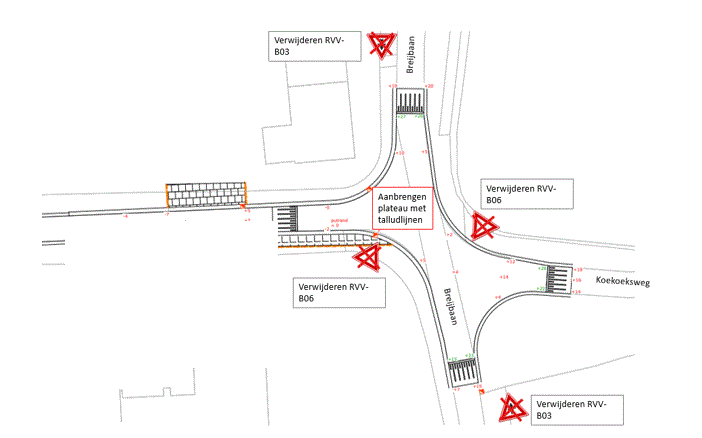 Voorrangssituatie op de kruising Koekoeksweg / Breijbaan aan te passen van een voorrangskruising naar een gelijkwaardige kruising en te voorzien van een verkeersplateau.