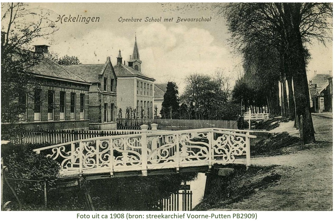 De destijds zelfstandige gemeente Hekelingen had reeds een openbare lagere school aan het begin van de 19e eeuw, deze school voldeed echter niet meer aan het eind van de 19e eeuw. De gemeente besloot daarom tot de bouw van een nieuw schoolgebouw met een directeurswoning. Als locatie hiervoor werd in 1879 een stuk bouwland van de diaconie van de hervormde gemeente van Hekelingen aan de Dorpsstraat gekocht. Voor het ontwerp van de school en de woning werd de architect Jacob Isaac van Waning aangetrokken. Van Waning, geboren als zoon van een Bleiswijkse burgermeester was een veelzijdig man. Hij importeerde hardhout uit Suriname en werd later eigenaar van een betonfabriek, dit bedrijf was één van de eerste bedrijven in Nederland die gewapend beton leverde. Tevens was Van Waning een betrokken burger, hij vervulde diverse maatschappelijke bestuursfuncties.1